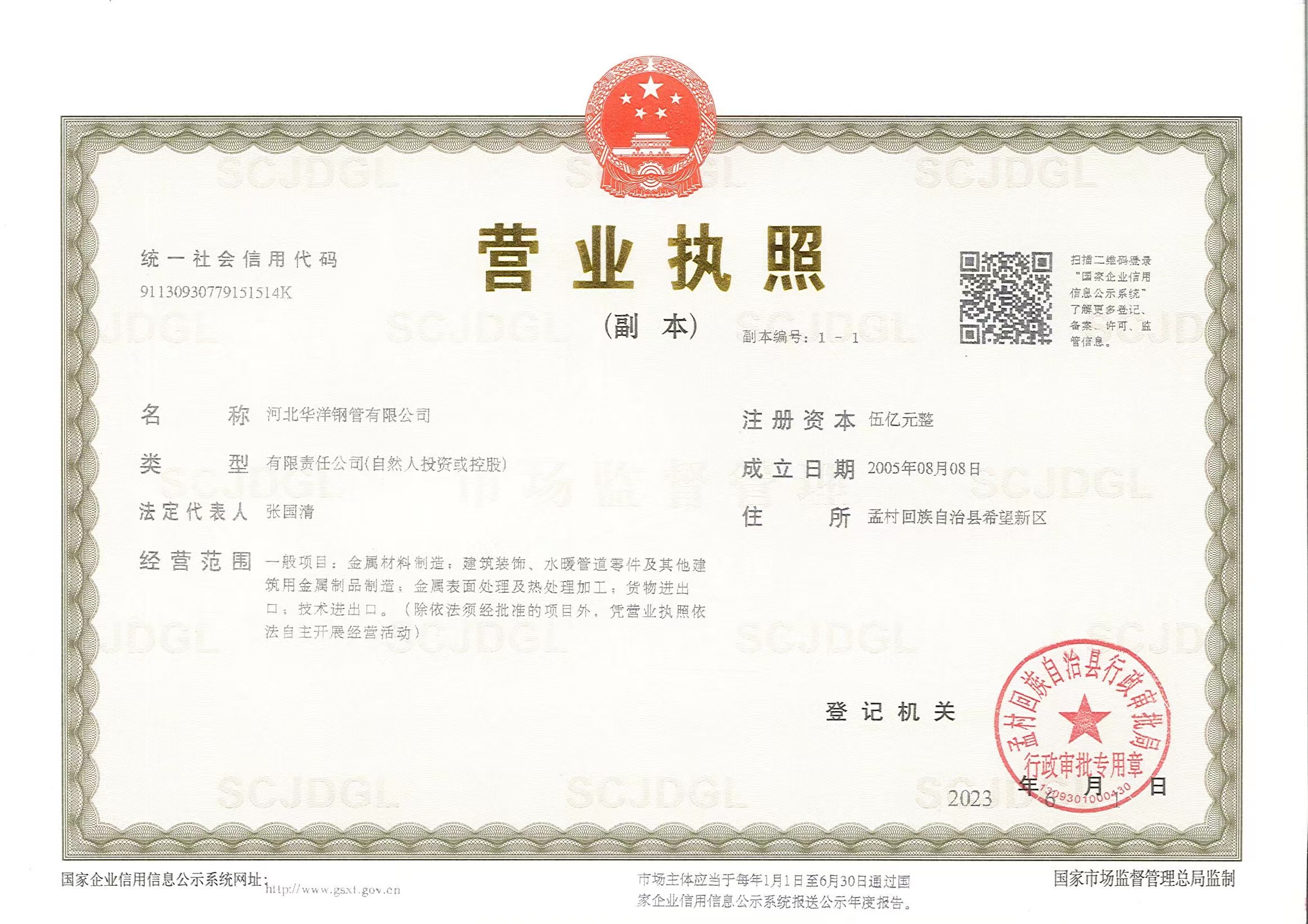 河北華洋鋼管有限公司公司創建于2005年,注冊資金5億元,公司占地面積1000余畝,固定資產12億元,年銷售收入近100億元,現有員工600余人。“華洋牌"高頻直焊鋼管被評為“河北省名牌產品”,年生產能力可達260萬噸,2024年河北華洋鋼管有限公司榮獲河北省百強民營企業(69位),河北省百強制造業(57位)榮譽稱號。